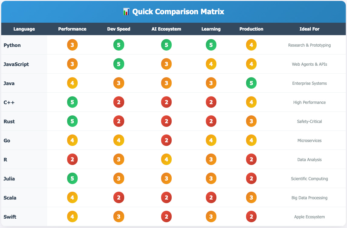 LLM orchestration and unmatched AI ecosystem: PythonHigh-performance agents with memory efficiency: RustReal-time agent networks with simple deployment: GoWeb-embedded agents and async superpowers: JavascriptScientific modeling, Statistical computing agents: Julia/ RBattle-tested, Enterprise-grade tooling: Java